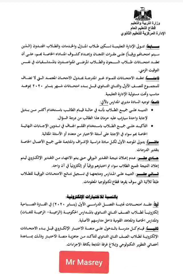 نظام امتحانات الجديد وعدد الاسئلة لكل مواد اولى ثانوى وتانية ثانوى